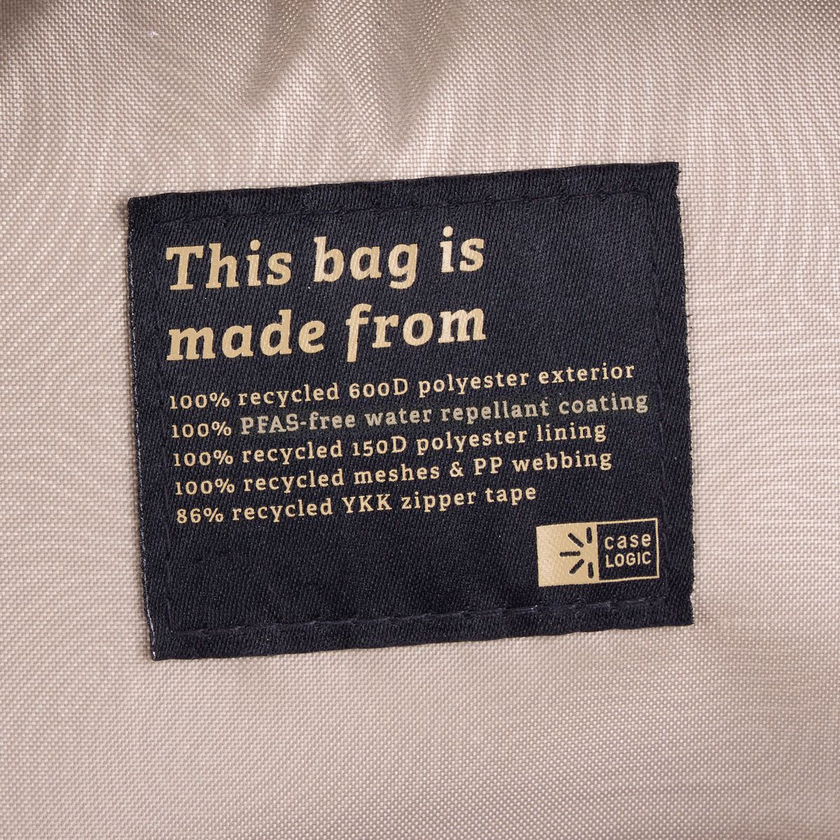 • tento batoh je vyrobený ze 100 % recyklovaného polyesteru 600D, polyesterové vnitřní výstelky 150D, síťoviny, PP pásků a z 86 % recyklované tkaniny zipu YKK