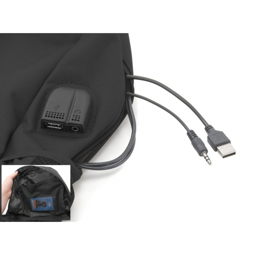Díky důmyslně umístěnému USB a sluchátkovému konektoru, lze propojit zařízení uvnitř tašky např. se sluchátky.