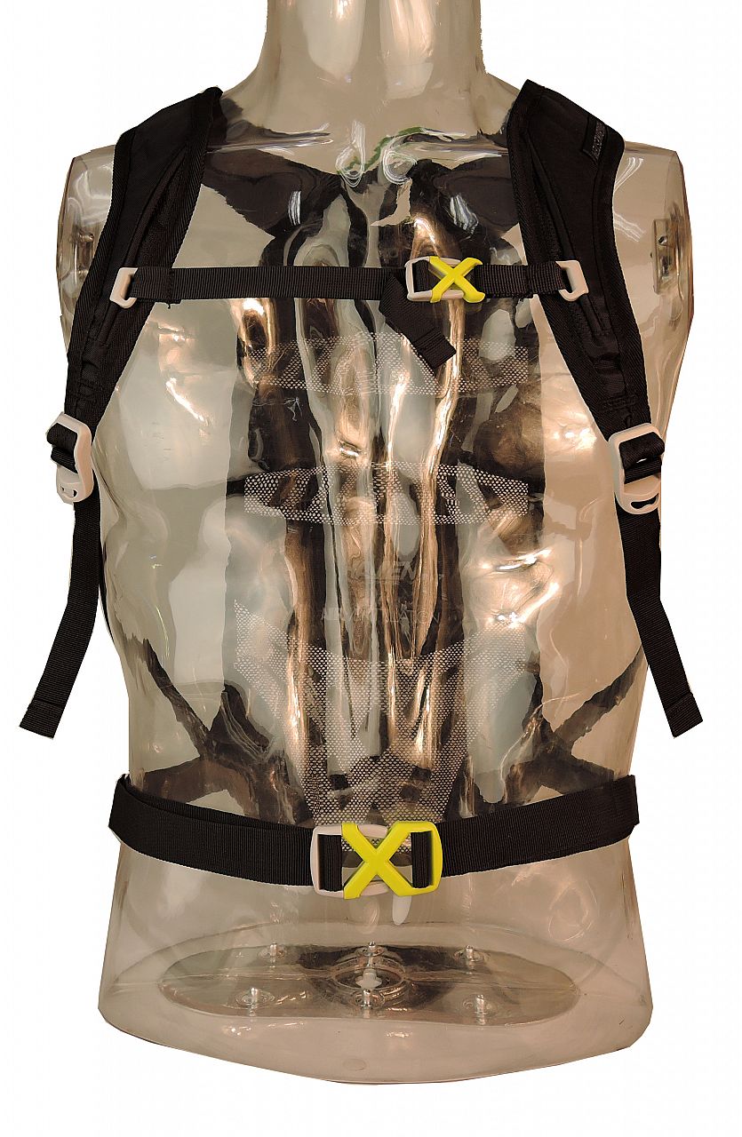 Dokonale odvětrané a ergonomicky tvarované zádové polstrování AIRVENTILATION upínací systém batohu na tělo RUN&BIKESTEM s nastavitelným ramenním, hrudním a bederním pásem.