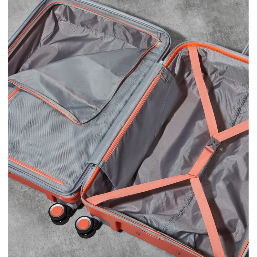 Kufr je uzavíratelný zipem, oba jezdce zipu se dají zapojit do TSA zapuštěného kódového zámku. U kufru lze pomocí druhého zipu zvětšit vnitřní objem. Horní i boční madlo je plastové. Má lehký výsuvný systém, prostor na víku oddělený textilní přepážkou, vnitřní kapsy a jistící popruhy.