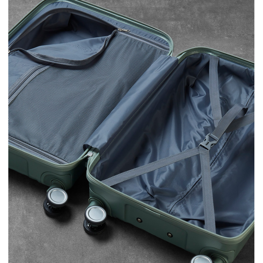 Kufr je uzavíratelný zipem. Oba jezdce zipu mají očko pro pohodlné nasazení kódového nebo klíčového zámku. Horní i boční madlo je plastové. Má lehký výsuvný systém, prostor na víku oddělený textilní přepážkou, vnitřní kapsu a jistící popruhy.
