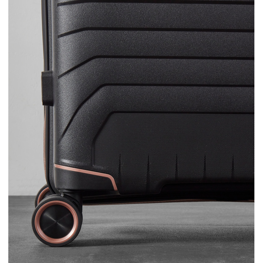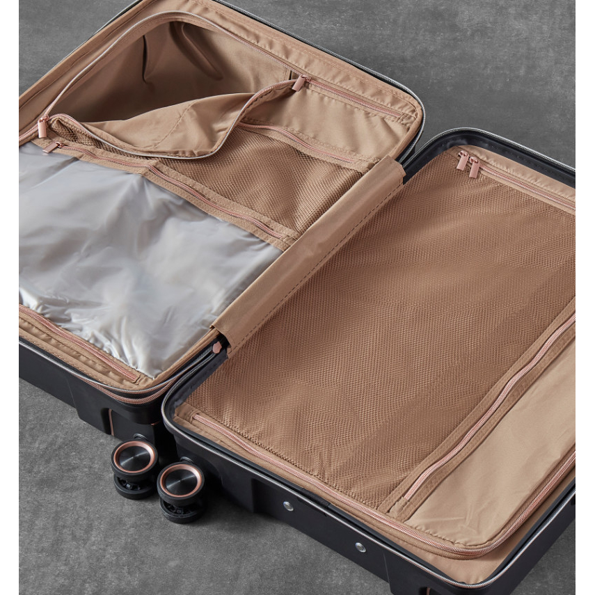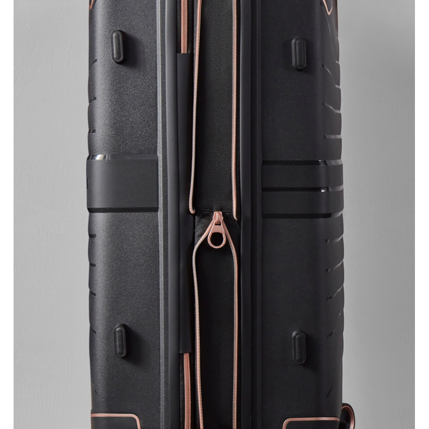 Kufr je uzavíratelný zipem, oba jezdce zipu se dají zapojit do TSA zapuštěného kódového zámku. U kufru lze pomocí druhého zipu zvětšit vnitřní objem. Horní i boční madlo je plastové. Má lehký výsuvný systém, prostor na víku oddělený textilní přepážkou, vnitřní kapsy a jistící popruhy.