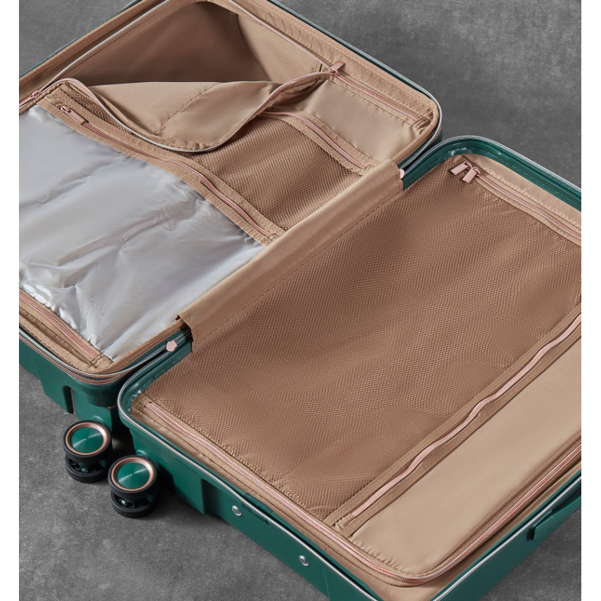 Kufr je uzavíratelný zipem, oba jezdce zipu se dají zapojit do TSA zapuštěného kódového zámku. U kufru lze pomocí druhého zipu zvětšit vnitřní objem. Horní i boční madlo je plastové. Má lehký výsuvný systém, prostor na víku oddělený textilní přepážkou, vnitřní kapsy a jistící popruhy.