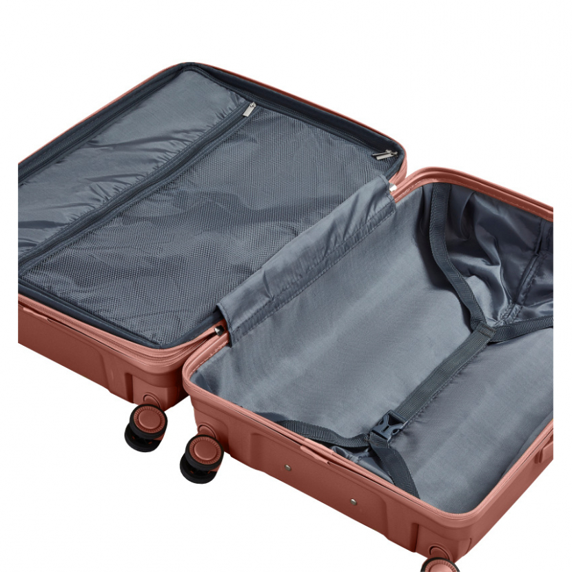 Celý pojízdný systém je umístěn uvnitř kufru pod textilní podšívkou, aby nedošlo k poškození systému při přepravě a je opatřen čtyřmi dvojitými kolečky otočnými o 360°. Kufr má lehký výsuvný systém, vnitřní přepážku a jistící popruhy.