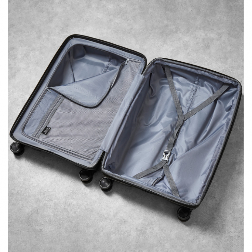 Kufr je uzavíratelný zipem, oba jezdce zipu se dají zapojit do TSA zapuštěného kódového zámku. U kufru lze pomocí druhého zipu zvětšit vnitřní objem. Horní madlo je plastové. Má lehký teleskopický výsuvný systém, prostor na víku oddělený textilní přepážkou, vnitřní kapsu a jistící popruhy.