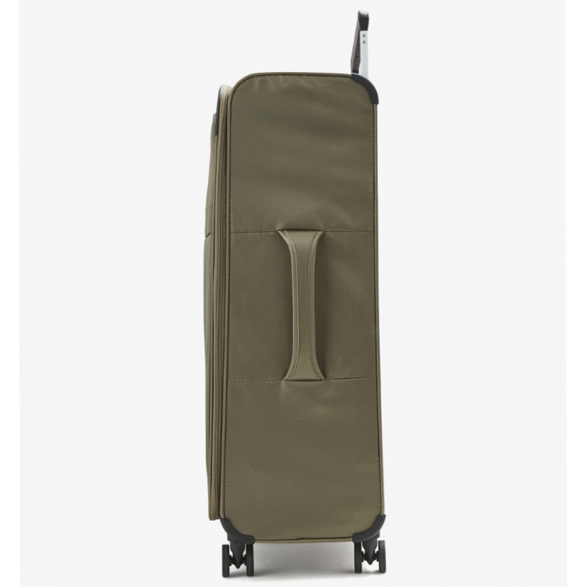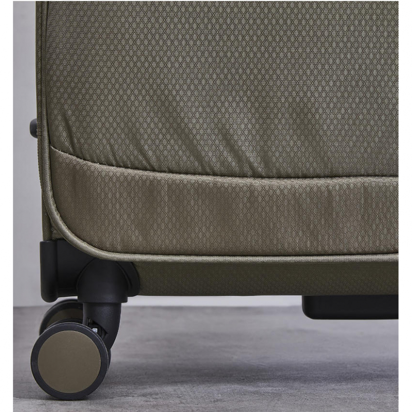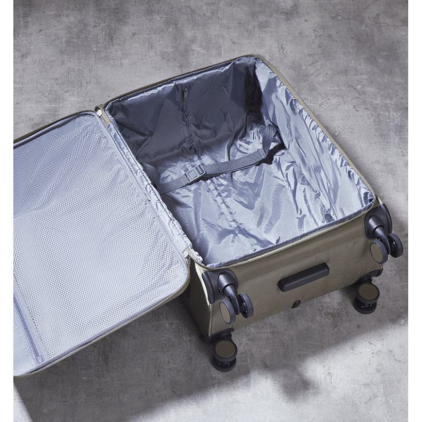 V přední části jsou umístěny dvě kapsy uzavíratelné zipem. Horní madlo je plastové a boční madlo je polstrované v barvě kufru. Celý pojízdný systém je umístěn uvnitř kufru pod textilní podšívkou, aby nedošlo k poškození systému při přepravě a je opatřen čtyřmi dvojitými kolečky otočnými o 360°. Kufr má lehký výsuvný systém, kapsu na vnitřní straně víka a jistící popruhy.