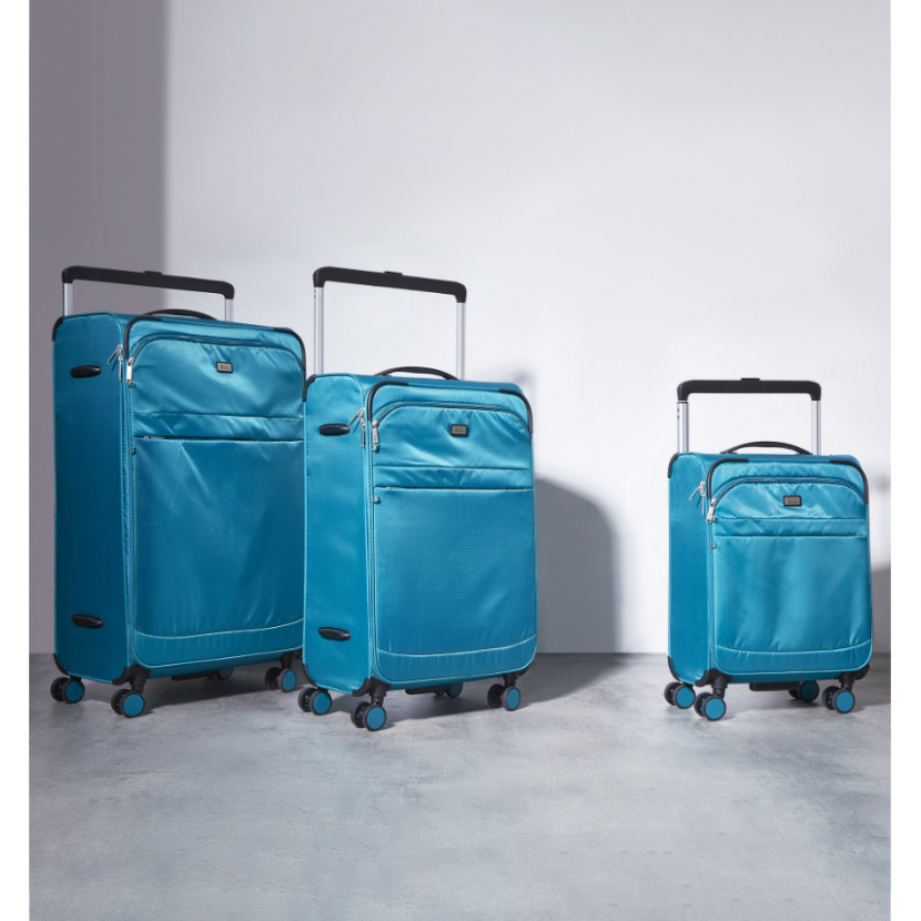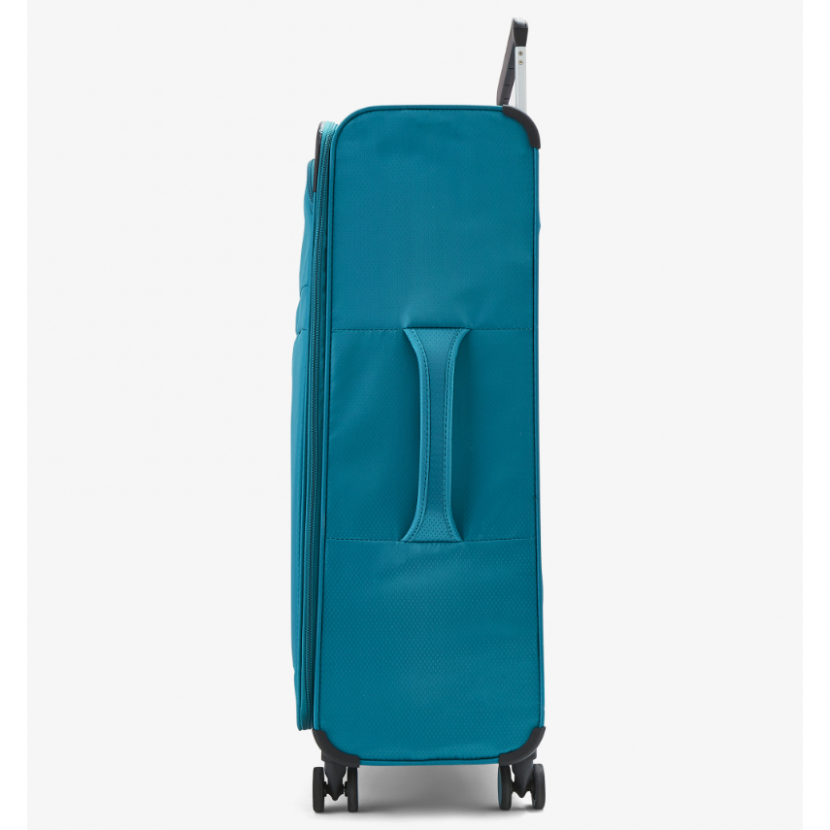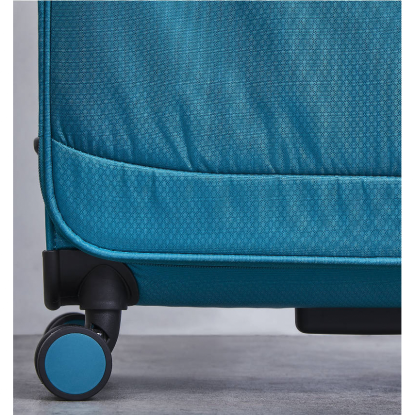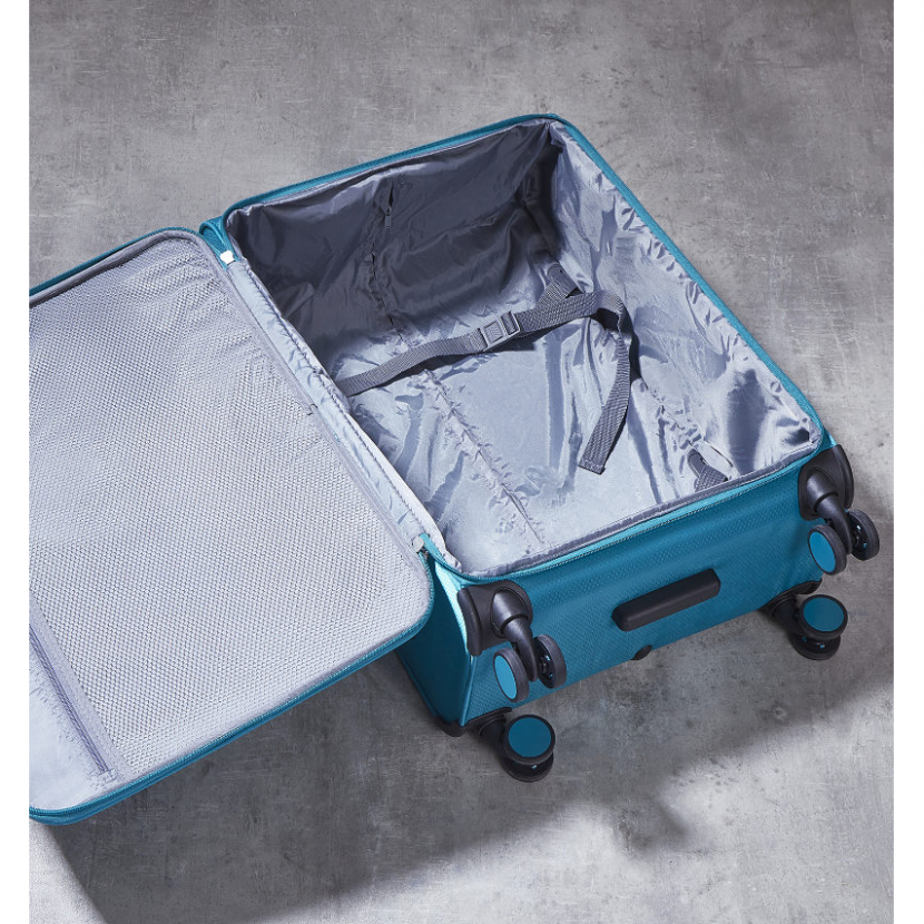V přední části jsou umístěny dvě kapsy uzavíratelné zipem. Horní madlo je plastové a boční madlo je polstrované v barvě kufru. Celý pojízdný systém je umístěn uvnitř kufru pod textilní podšívkou, aby nedošlo k poškození systému při přepravě a je opatřen čtyřmi dvojitými kolečky otočnými o 360°. Kufr má lehký výsuvný systém, kapsu na vnitřní straně víka a jistící popruhy.