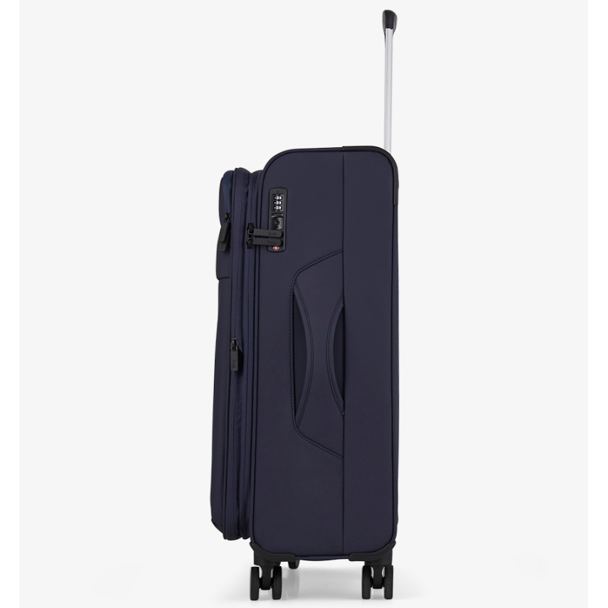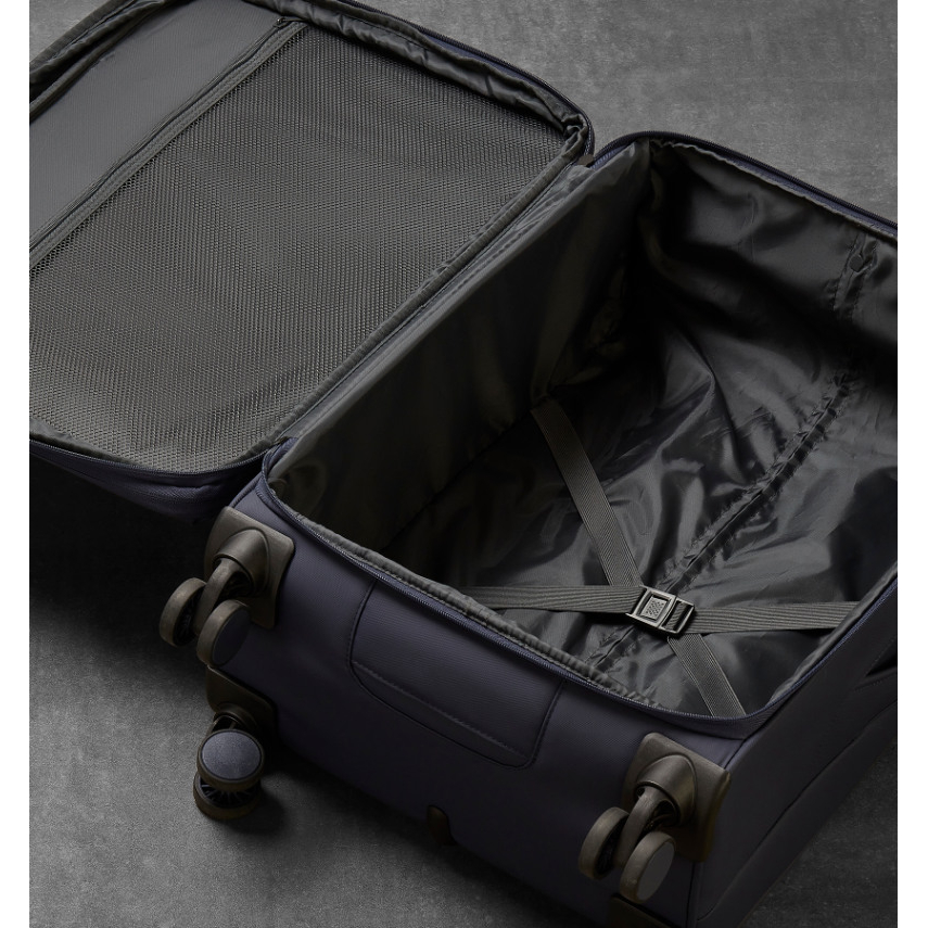 U kufru lze pomocí druhého zipu zvětšit vnitřní objem. V přední části jsou umístěny dvě menší kapsy uzavíratelné zipem. Horní i boční madlo je polstrované v barvě kufru. Celý pojízdný systém je umístěn uvnitř kufru pod textilní podšívkou, aby nedošlo k poškození systému při přepravě, a je opatřen čtyřmi dvojitými kolečky otočnými o 360°. Na vnitřní straně víka je kapsa na zip.