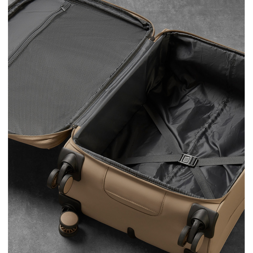 U kufru lze pomocí druhého zipu zvětšit vnitřní objem. V přední části jsou umístěny dvě menší kapsy uzavíratelné zipem. Horní i boční madlo je polstrované v barvě kufru. Celý pojízdný systém je umístěn uvnitř kufru pod textilní podšívkou, aby nedošlo k poškození systému při přepravě, a je opatřen čtyřmi dvojitými kolečky otočnými o 360°. Na vnitřní straně víka je kapsa na zip.