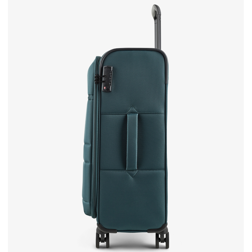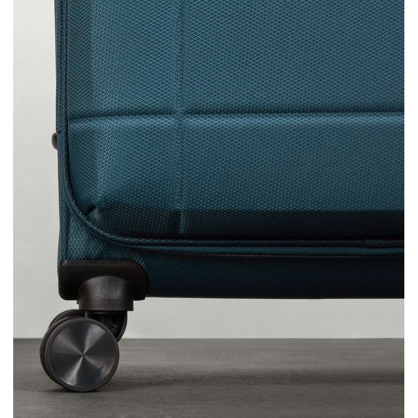 Na přední části je jedna menší kapsa uzavíratelná zipem. Horní i boční madlo je polstrované v barvě kufru. Celý pojízdný systém je umístěn uvnitř kufru pod textilní podšívkou, aby nedošlo k poškození systému při přepravě, a je opatřen čtyřmi dvojitými kolečky otočnými o 360°. Na vnitřní straně víka je kapsa na zip.