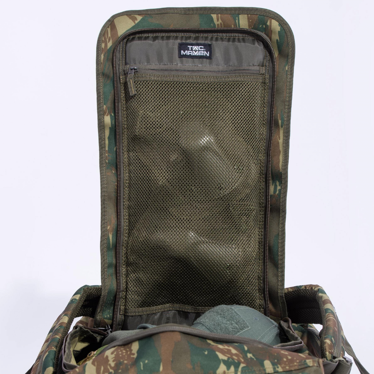 Přepravní a cestovní taška od řecké značky Tac Maven o obsahu 45 litrů. Lze ji přenášet v ruce za sepnutelná ucha či jako batoh pomocí nastavitelných odepínatelných a polstrovaných popruhů.