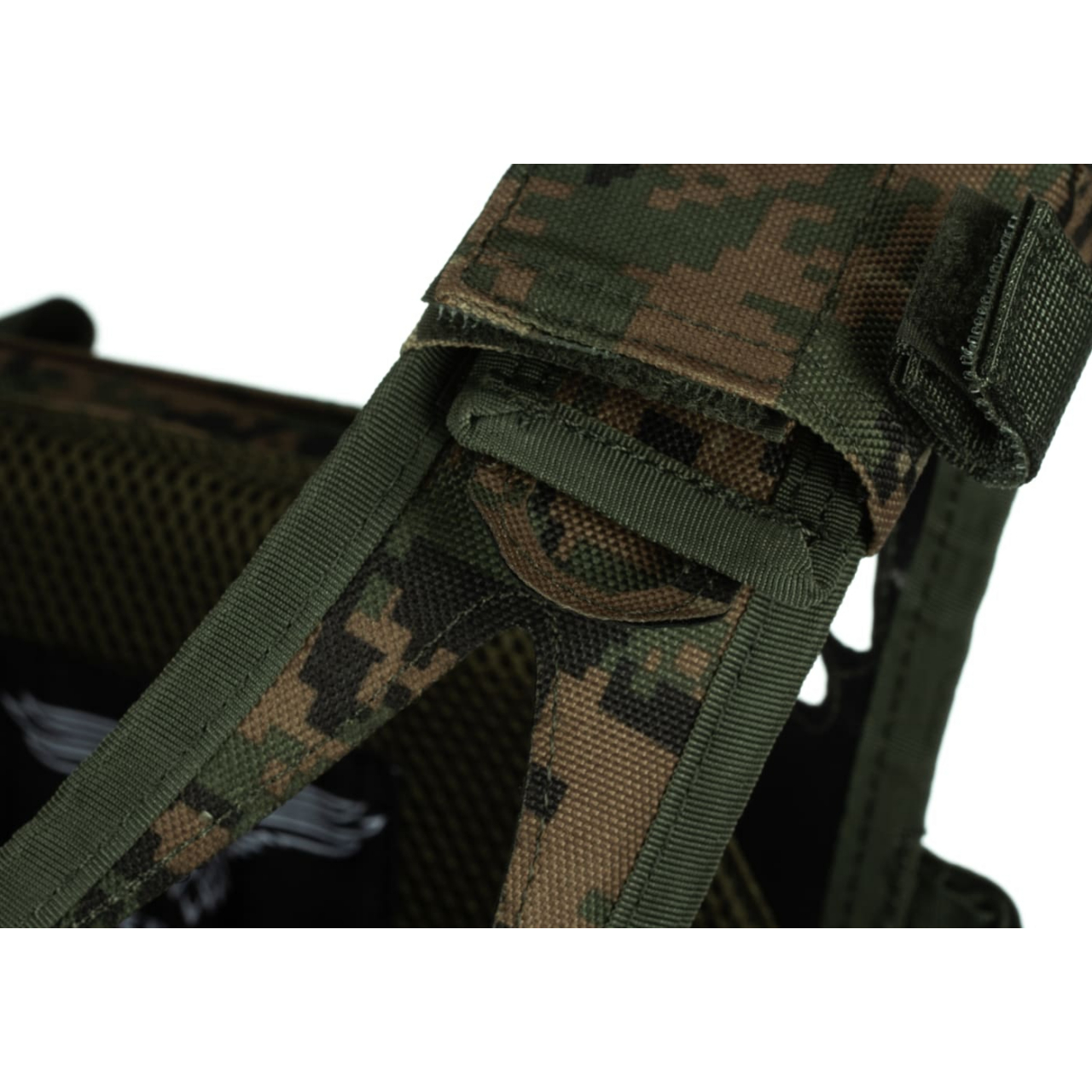 Vesta pevně drží, je přichycena kolem pasu pomocí popruhů na suchý zip a dalšími MOLLE prvky po stranách.