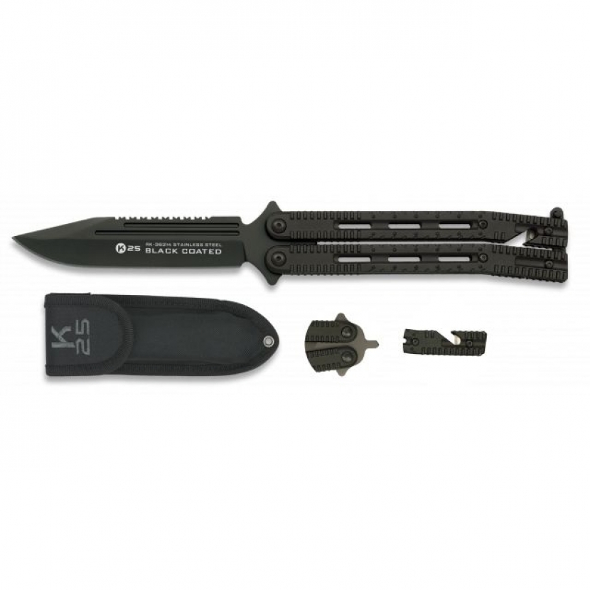 Kovový zavírací nůž, tzv. motýlek s šedým titanovým povrchem.