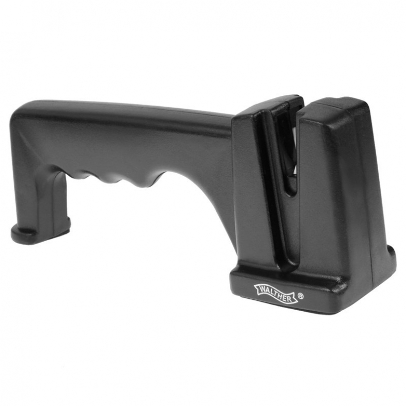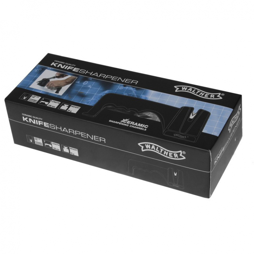 Keramický brousek Walther na ocelové nože. Keramické ostřící tyče uspořádány do V-tvaru. Robustní kryt a protiskluzové nožičky.