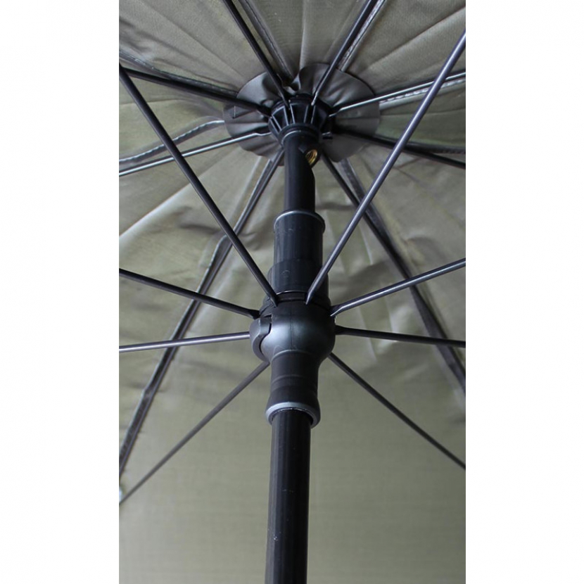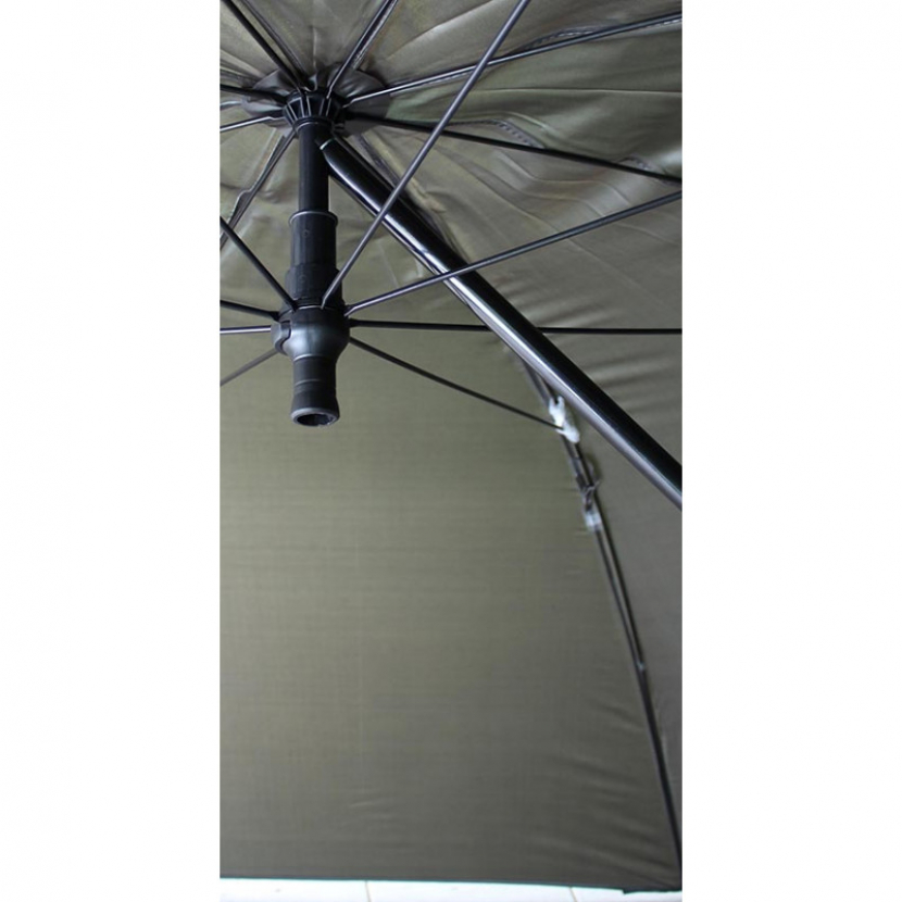 Deštník s bočnicí Full Cover CAMO z materiálu 210D. Švy jsou podlepené, po obvodu vrchlíku jsou čtyři očka k ukotvení, deštník je dodáván se čtyřmi stavitelnými provazy a kolíky. Deštník lze naklápět pomocí kovového CNC kloubu. Žebra jsou z ocelových drátů 1,25 m dlouhých, eloxovaných černou barvou.