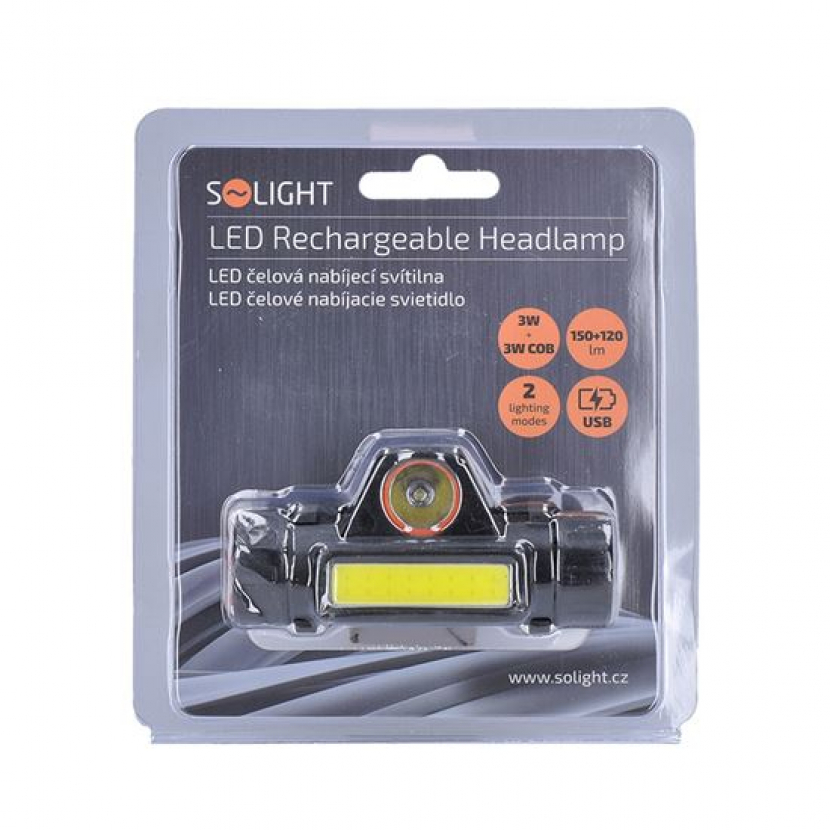 Nabíjecí LED čelová svítilna od značky Solight. S bodovým a prostorovým světlem.