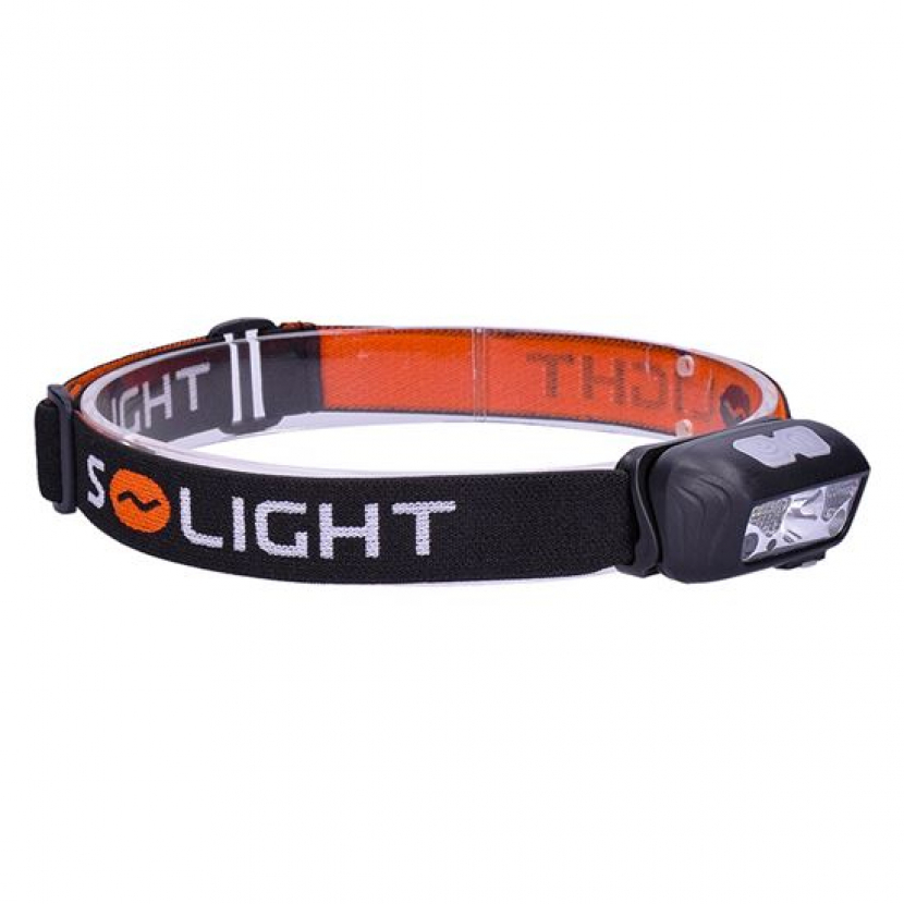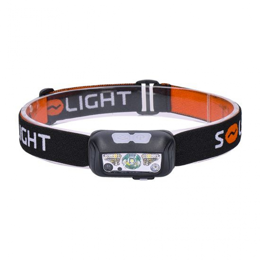 Nabíjecí LED čelová svítilna od značky Solight. S bodovým, prostorový a výstražným červeným světlem.