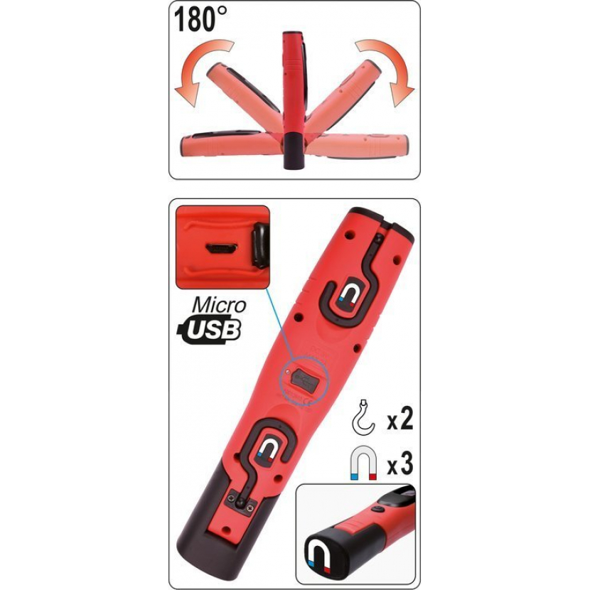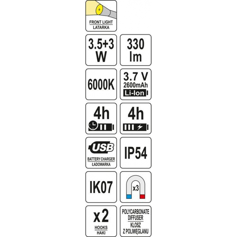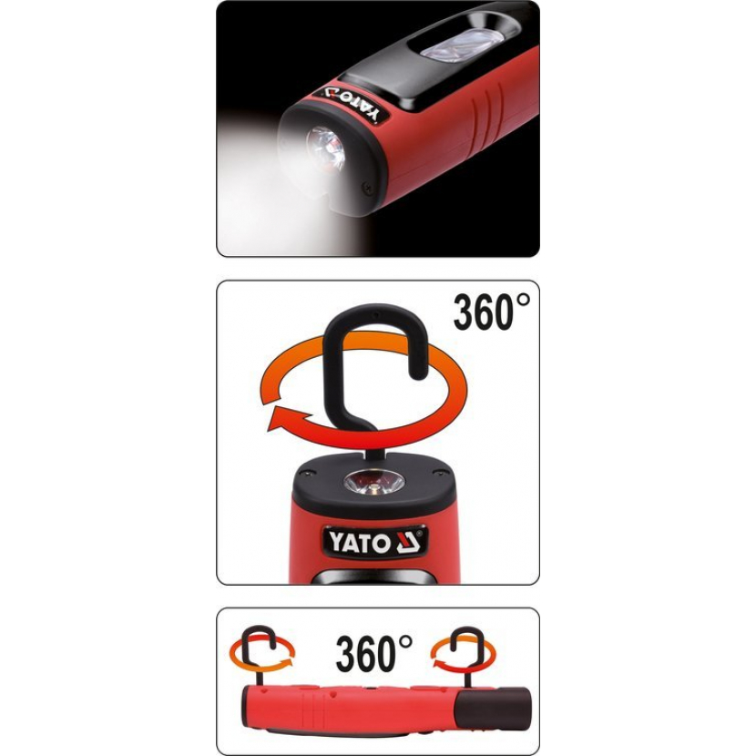 Nabíjecí dílenská lampa YATO s 330lm hlavním světlem a 80lm baterkou. Model je vybavený prostornou, lithium-iontovou baterií s kapacitou 2600mAh, která poskytne minimálně 4 hodiny nepřetržitého provozu. Vyrobeno z odolných materiálů vč. ABS a polykarbonát, které zajišťují třídu mechanické ochrany IK07 a třídu těsnosti IP54.