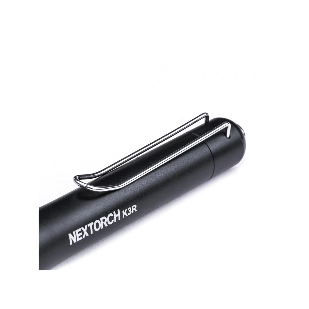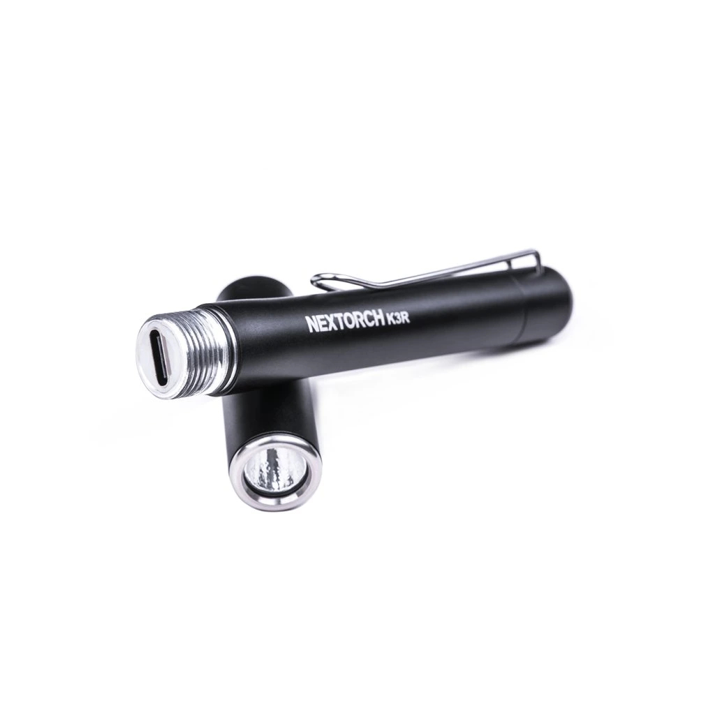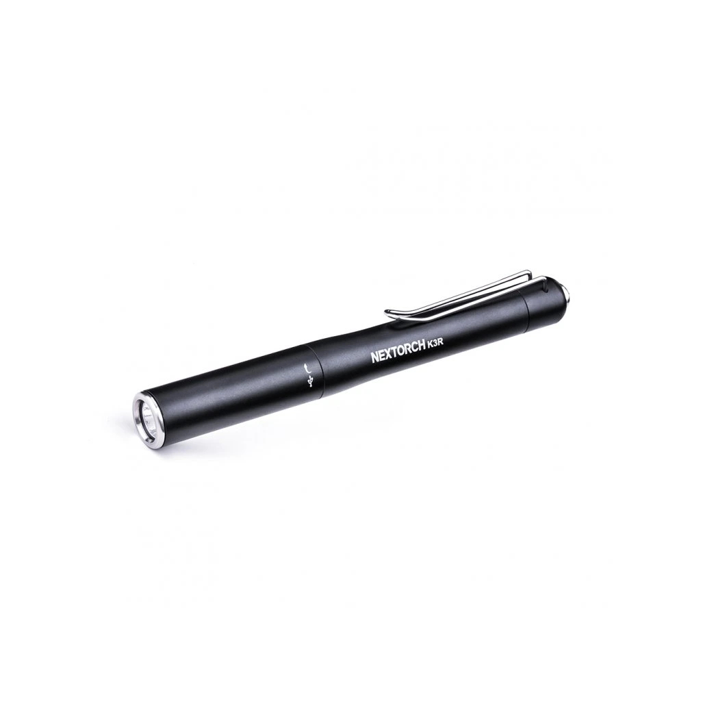 Praktická nabíjecí svítilna Nextorch K3R se díky svým rozměrům a praktickému klipu vejde do každé kapsy. Výkon je úctyhodných 350 lm a dosvit až 71 m. Lze použít jako lékařská pomůcka v ordinaci u lékaře. Nabíjecí USB-C port je umístěn pod hlavou svítilny, kdy pro nabíjení je nutné svítilnu rozšroubovat. Vestavěný akumulátor má kapacitu 320 mAh.