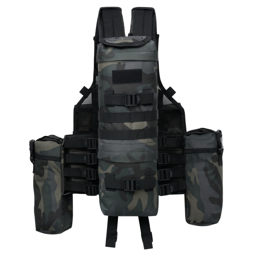 Boční strany vesty obsahují 2 velké přihrádky (25 x 12 x 9 cm) s rychloupínacími přezkami, rychlý přístup se suchým zipem, 2 malé připojené kapsy se suchým zipem a pas nastavitelný se 4 popruhy na každé straně.